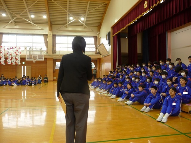 5年生の演奏に合わせて退場した後、6年生からバトンを引き継いで中心となって頑張った5年生は校長先生からねぎらいの言葉をかけてもらい、がんばりを誉めてもらいました。