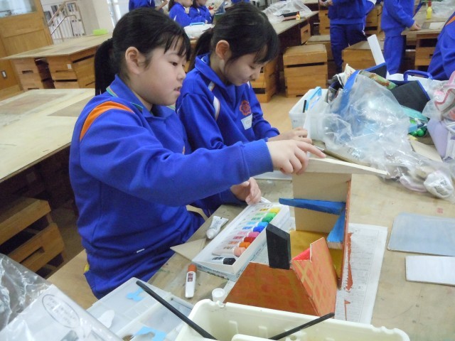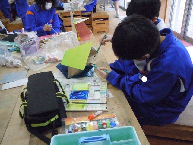 図画工作の時間です。カクカクに切った板を組み立てています。薄い板を組み立てるのは主にボンドの力です。乾くまで友達と協力したり、支える小物を添えたりと工夫しています。