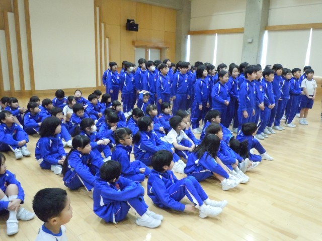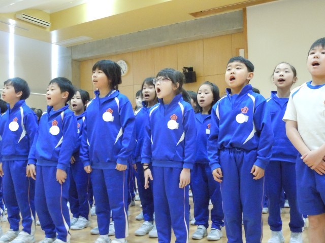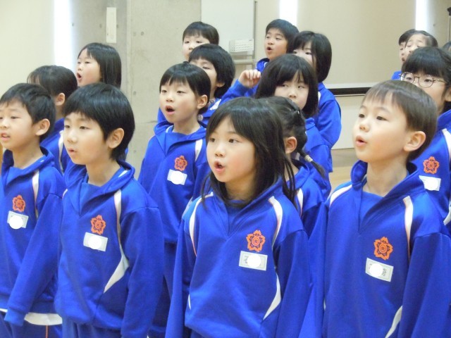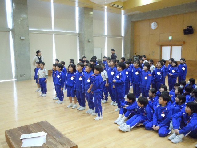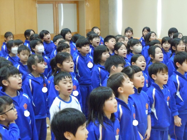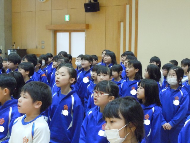 音楽の時間です。1年生と2年生が一緒に歌の練習をしています。卒業式に歌う歌の歌詞の意味やよりよい歌い方を聞き、練習しています。2年生は大きな口を開けて歌い、1年生は真剣に2年生の様子を見ています。