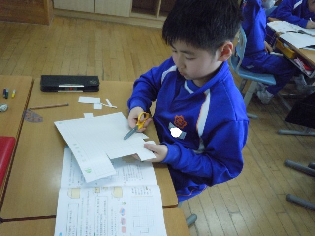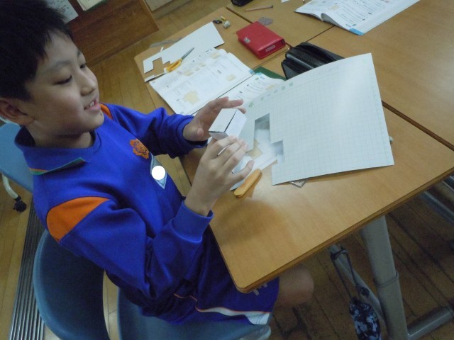 算数の時間です。直方体をつくるために直方体を切り開きました。切り開いてできた展開図から、面や辺の関係を確認して工作用紙でつくっています。実際に辺を折り組み立てて直方体が出来上がると、にっこりして満足そうです。