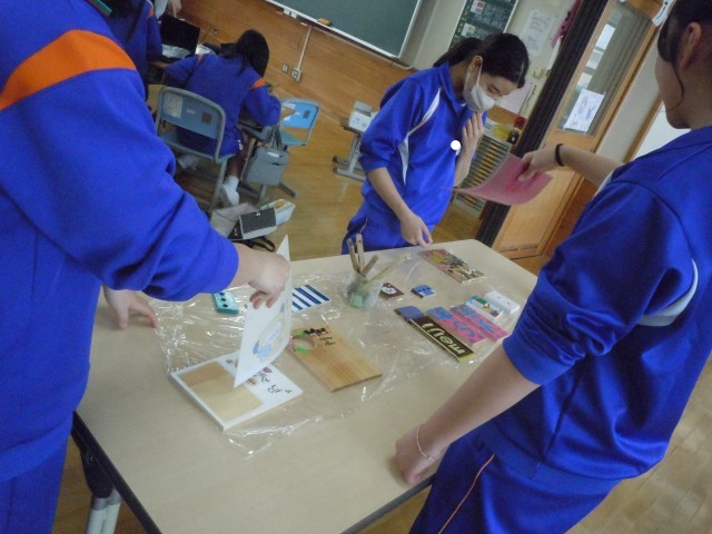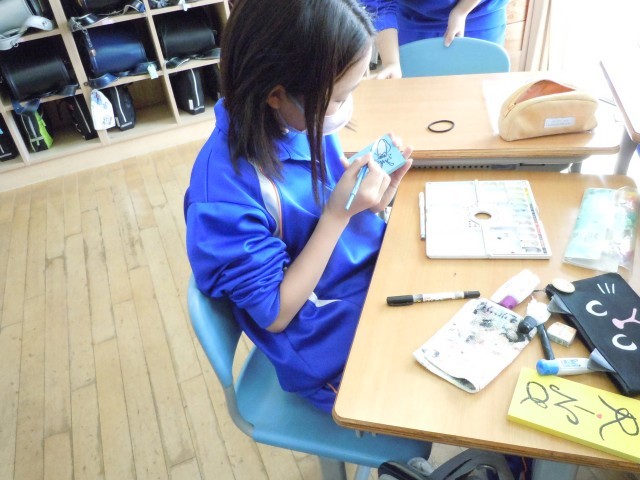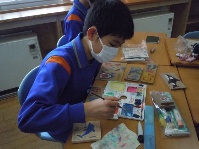 図画工作の時間です。卒業制作に取り組んでいます。好きなキャラクターを描いたり、デザインにこだわったり、鉛筆描きの上からニスを塗ったり。自分の好きなものを好きな形で表しています。