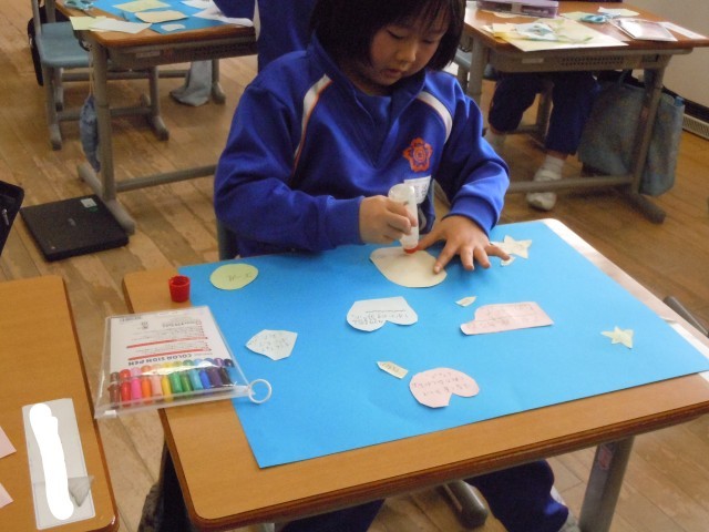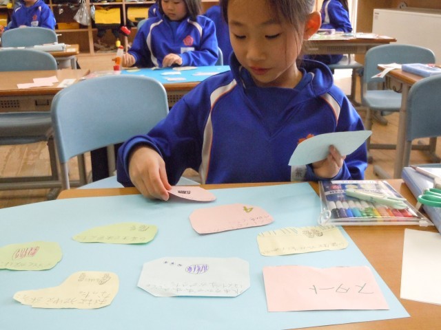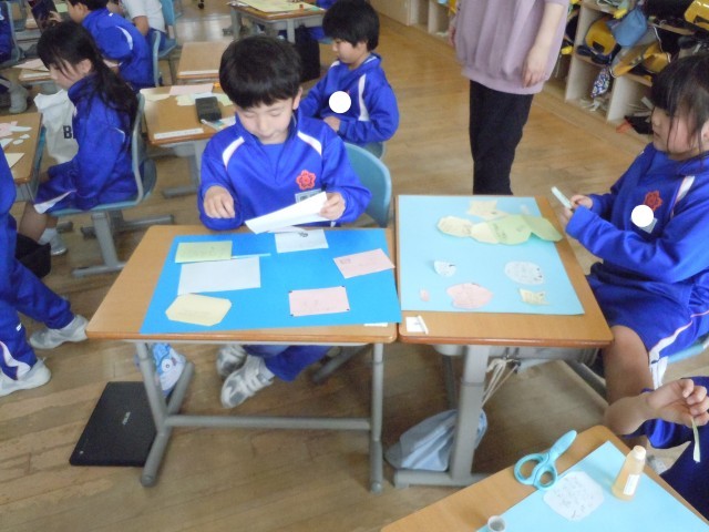 生活科の時間です。思いでカードがたくさん出来上がってきたので、つないですごろくにしています。画用紙いっぱいにつながると笑顔でいっぱいになるようです。