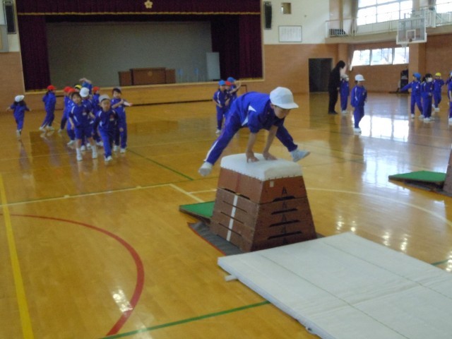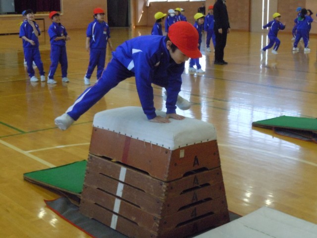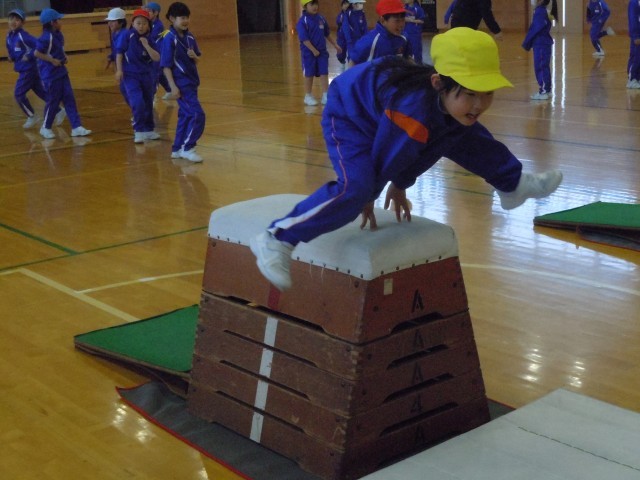 体育の時間です。「とび箱あそび」にチャレンジしています。自分でコースを選んで強く踏み切り、とび箱を跳び越えています。