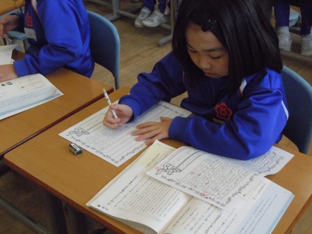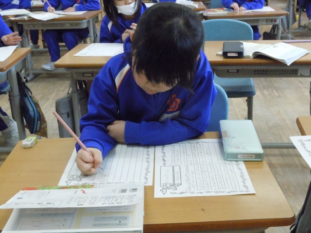 生活の時間です。1年間を振り返って、楽しかったこと、心に残ったことを文集にしようと原稿を書いています。1枚目の原稿を見直し、修正原稿の2枚目を丁寧に書いています。