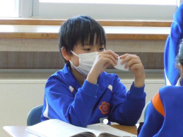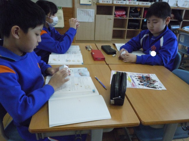 算数の時間です。直方体の面と面、辺と辺、面と辺の関係を調べています。自分で展開図をかいて作った直方体で考えています。