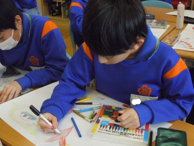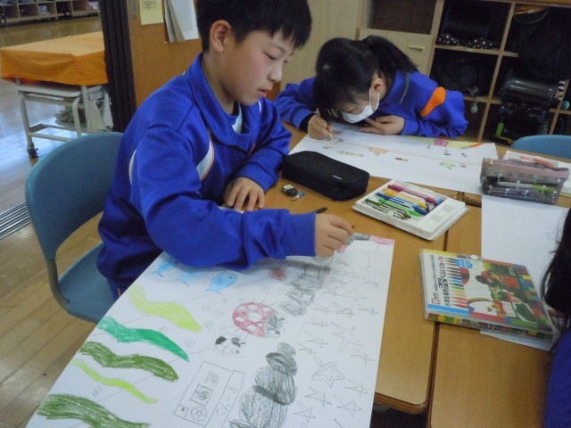 図画工作の時間です。「あったらいい町、どんな町」に取り組んでいます。自由な発想でのびのびと描いています。手が先に動くタイプとじっくり考えて描き始めるタイプに分かれるようです。