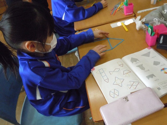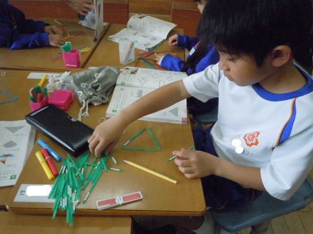 算数の時間です。数え棒を使って、提示された形をつくっています。数え棒の数が増えても、落ち着いて形をつくっています。