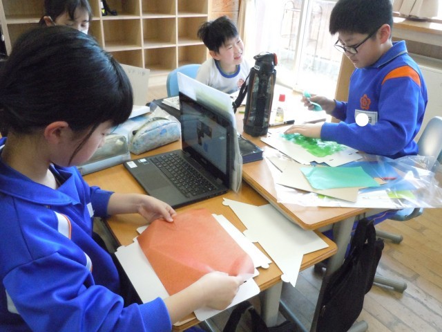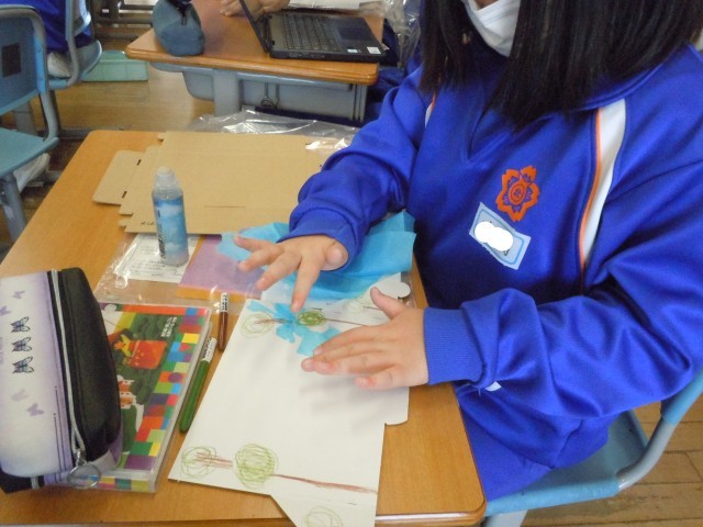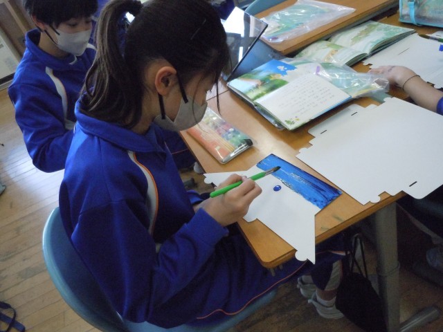 図画工作の時間です。「本を開くとお気に入りの場面」に取り組んでいます。お話のお気に入りの場面が飛び出す絵本のイメージです。絵具やカラーペンを自由に使い、貼り絵を取り入れるなど技法も様々です。