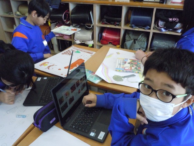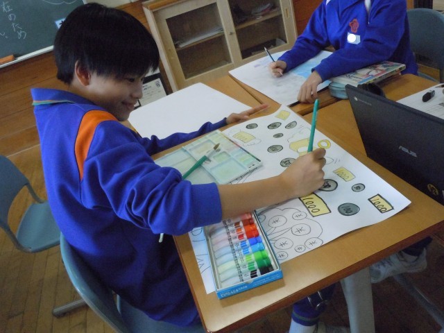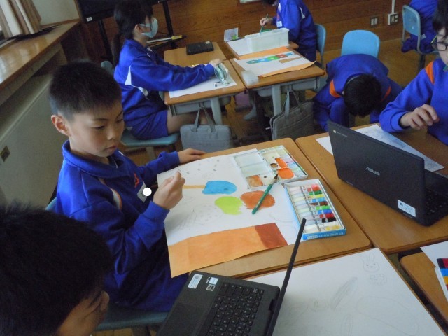 図画工作の時間です。「あったらいい町、どんな町」に取り組んでいます。すぐに思いついた子はにこにこしながら描いています。ゆっくり考える子はいろいろ迷うようです。