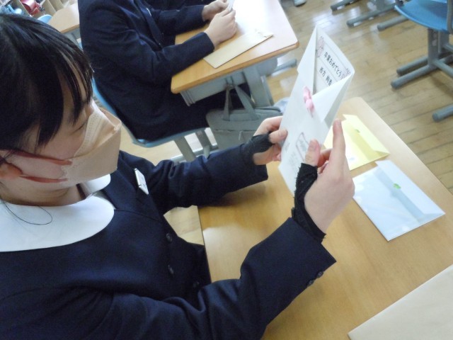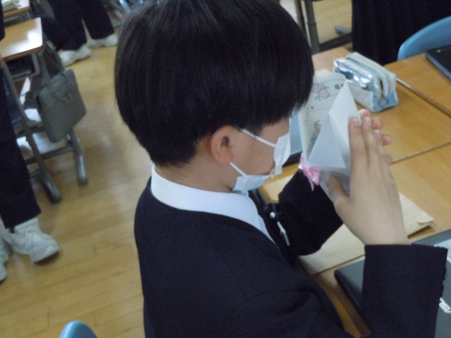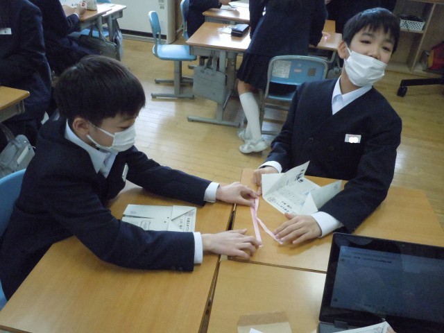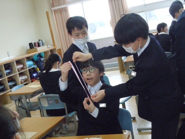 保健室の先生から6年間の成長の記録をいただきました。洋服のように折られた紙の中に記録が書かれているのですが、蝶ネクタイのように結ばれたリボンの長さは6年間に伸びた身長の長さです。かわいらしくきゅっと結ばれたリボンもあれば大きな蝶のようなリボンもあります。あまり自覚のない6年間の身長の変化ですが、リボンの大きさになることで友達と比べたり、自分に当てて入学当初の大きさを想像したりとみんなうれしそうでした。