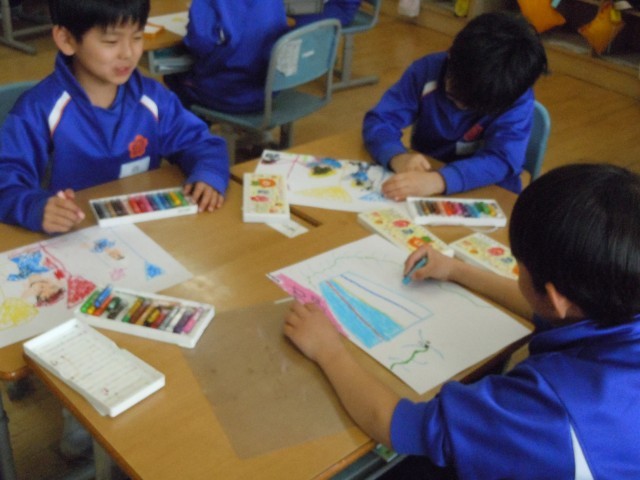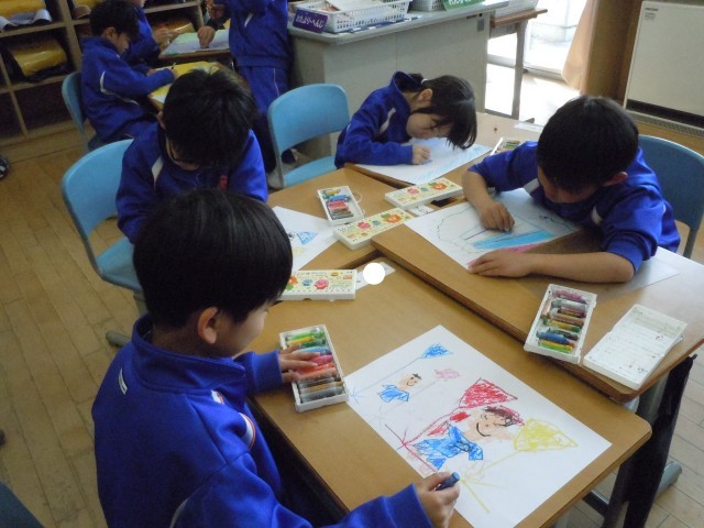 1年生として過ごした1年も終わりに近づいています。まもなく、この教室を出て2年生になりますが、この教室を新しい1年生のために楽しく飾りつけをします。学校生活の楽しい一コマを描き、新しい1年生に学校を楽しんでもらえるよう心を込めて描いています。