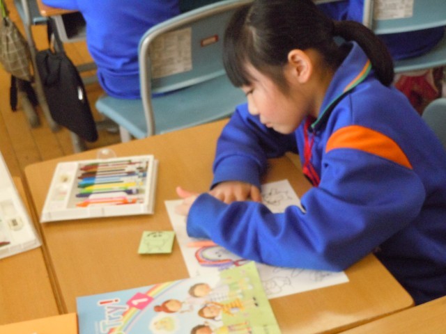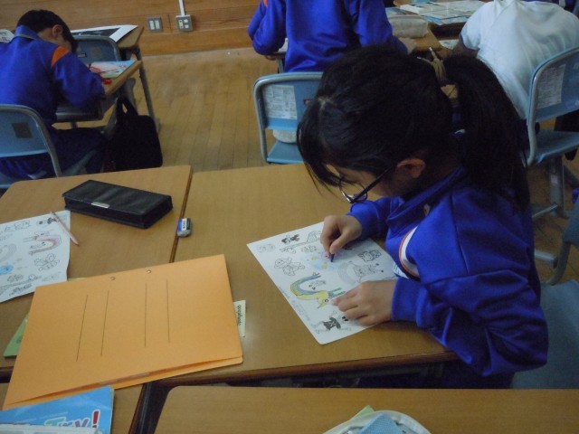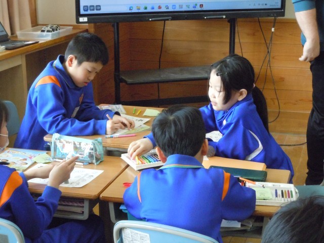 外国語活動の時間です。何になるのか心で決めて、当て合うクイズを英語で行っています。ヒントも英語で出しています。