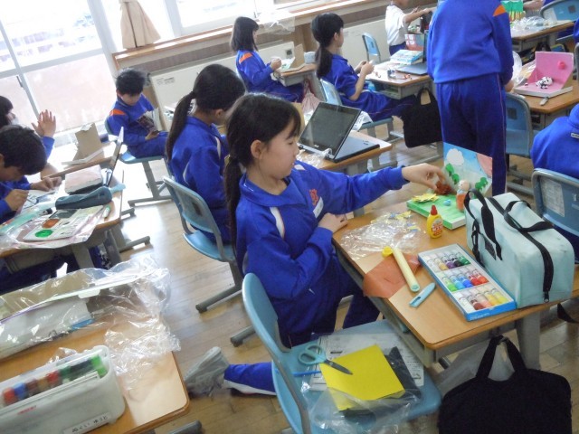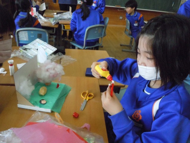図画工作の時間です。「本を開くとお気に入りの場面」に取り組んでいます。お気に入りの場面が次々とできてきました。