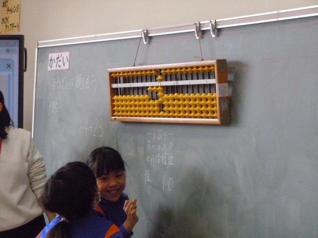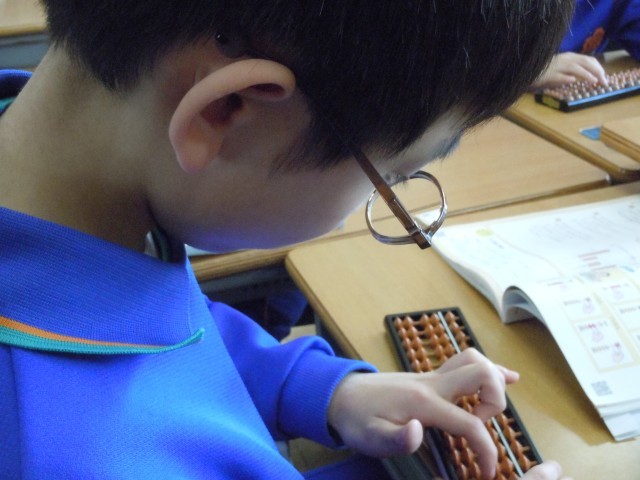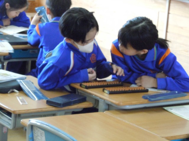 算数の時間です。そろばんに取り組んでいます。初めてそろばんに触る子もいます。習っている子に教えてもらう場面もあるようです。