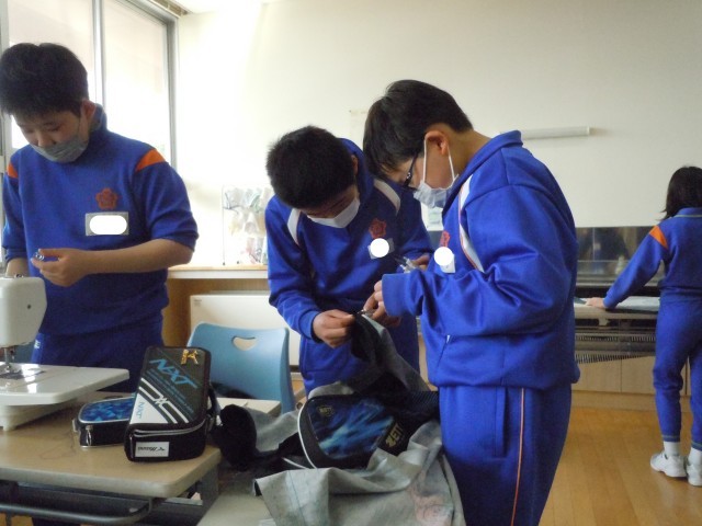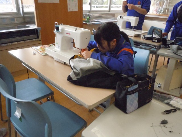 家庭科の時間です。エプロンが出来上がってきました。ひもを通して出来上がりです。