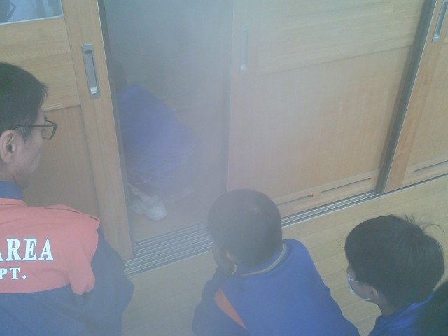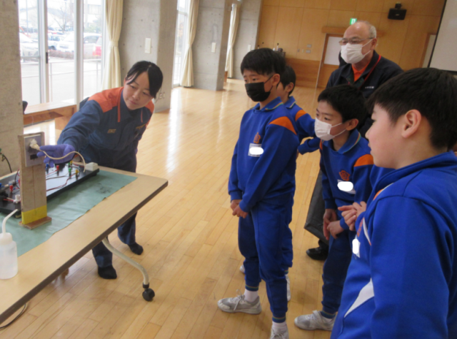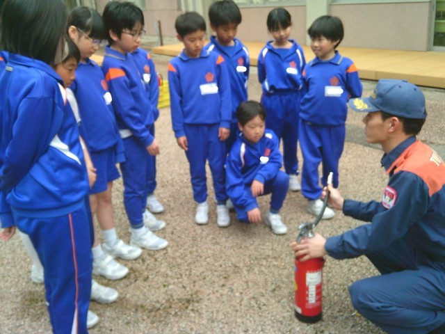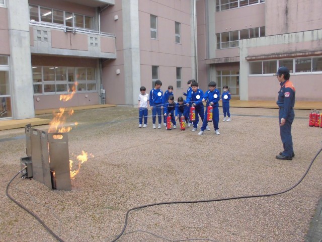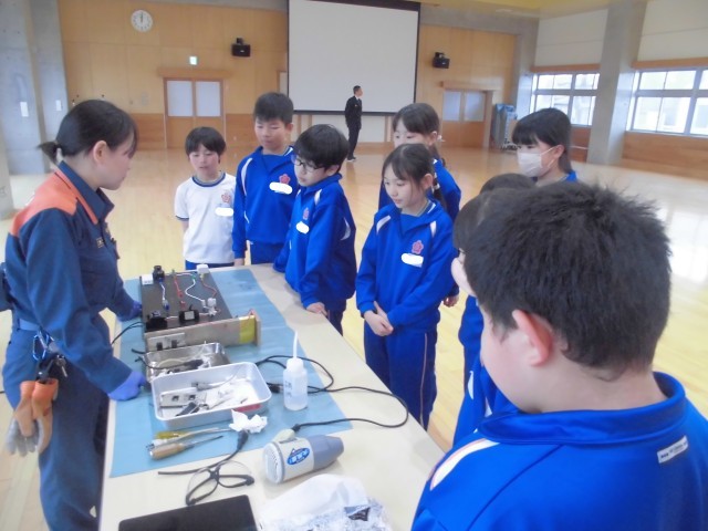 砺波消防署の方から防火について学んだあと、煙体験や電気実験、水消火器体験を行いました。