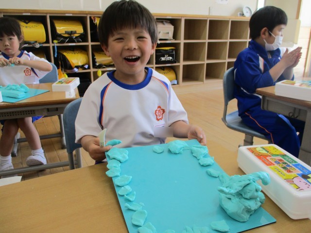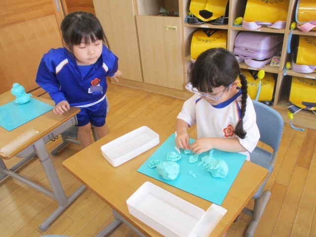 みんなでおだんごの形にしたり、ひものように長くしたり、好きなものを思い浮かべながら製作しました。