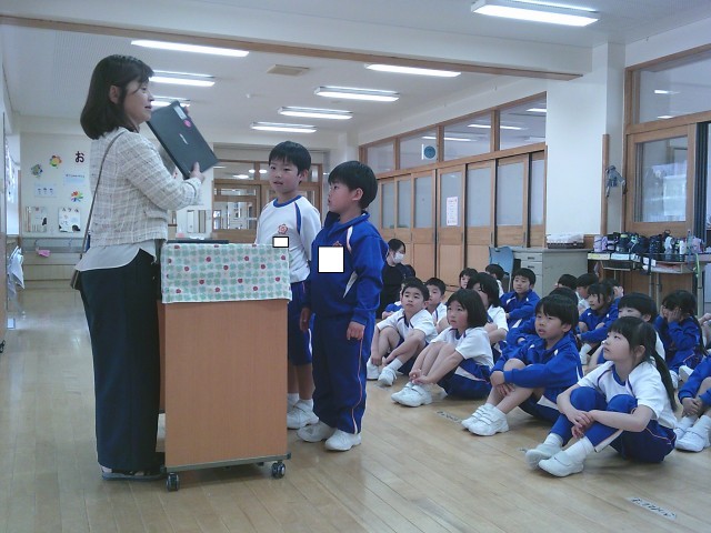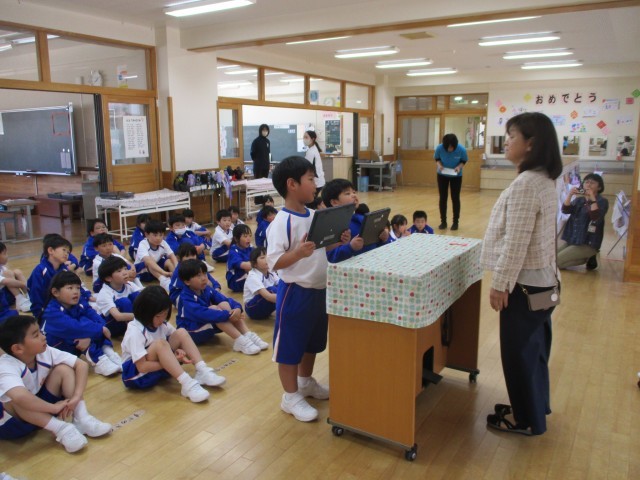 1年生のタブレット貸与式が行われました。代表の子供たちが「大切に使います」「学習に使います」と言い、校長先生からタブレットを受け取りました。砺波市から貸与を受けるタブレットについての注意をみんな真剣な顔で聞いていました。上級生と同じように毎日、学習に使用していきます。