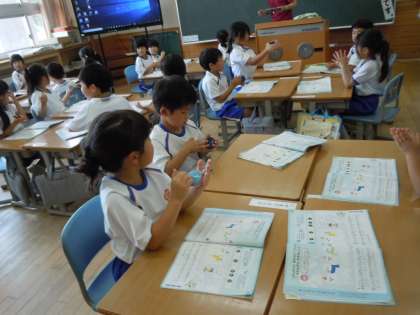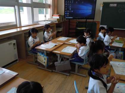 曲に合わせてリズムをうっています。カスタネットと手拍子の音が教室いっぱいに響きます。