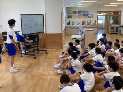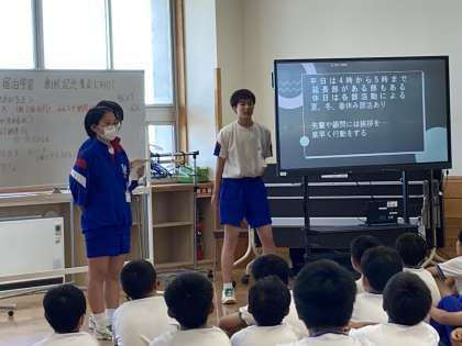 「14歳の挑戦」で砺波北部小学校に来ている出町中学校の皆さんが、中学校生活についての話をしてくださいました。来年中学生になる6年生は、真剣に聞いていました。