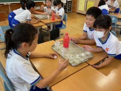 同じコップを使って、どちらのペットボトルに水が多く入るか調べました。
