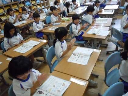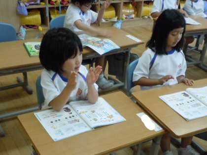 「ぶんぶんぶん」を歌っています。自然にリズムに合わせて手を打っています。曲の特徴を捉えて表現することができています。