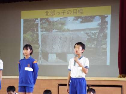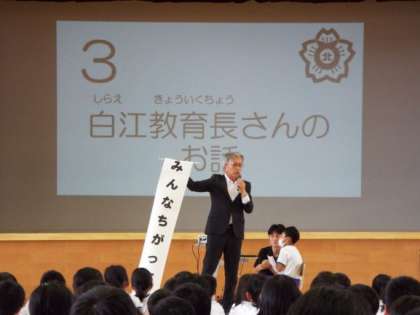 7月10日は砺波北部小学校の創校記念日です。6年生が中心となって集会を開き、55歳の誕生日をお祝いしました。6年生の発表の後、本校の卒業生である教育長さんから話を聞きました。