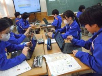 家庭科の時間です。「汚れに合った掃除をしよう」ということで校舎の汚れを調査しています。調査結果をどう生かしていくのか楽しみです。