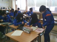 家庭科の時間です。炒め料理を作っています。「おいしー」「玉ねぎあまーい」とても満足な様子です。廊下で匂いに誘われた5年生がうらやましそうです。