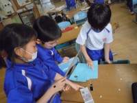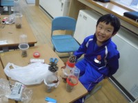 生活科の学習で、ファミリーパーク等で拾ってきた木の実や葉っぱを使っておもちゃを作...