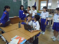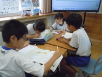外国語活動の時間です。大文字と小文字を比べています。そういえば、前のタブレット...