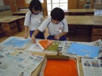 図画工作の時間です。木版画を刷りました。友達と協力してずれないように慎重に行っ...