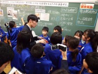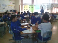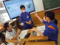 外国語の時間です。発表の準備をしています。ALTのデモンストレーションを見て、...