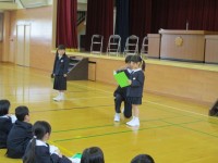 代表児童が、2学期がんばったこと、冬休みや3学期にがんばりたいことを発表した後、...