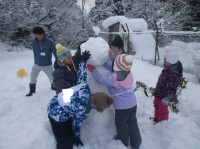 砺波青少年自然の家で下学年のスノースポーツ教室を行いました。雪遊びでは、班のメンバーと協力して雪だるまを作りました。「どの班よりも大きな雪だるまを作ろう」「石や木の枝を使って顔や手を付けたらかわいくな...