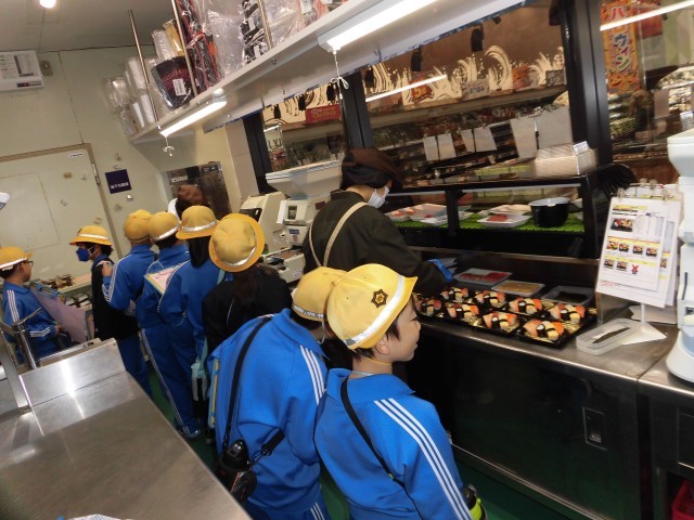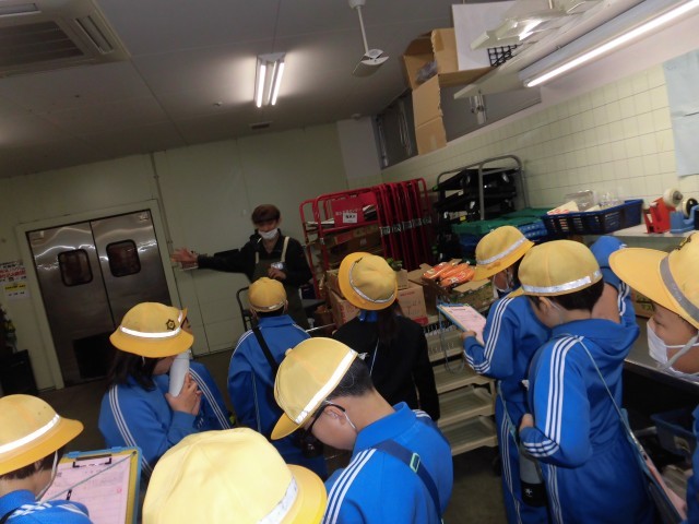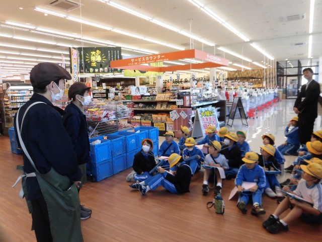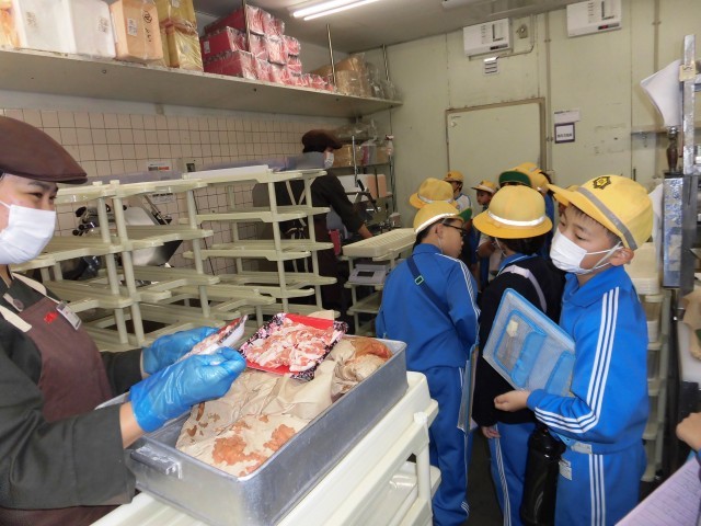 社会科の学習で、地域のスーパーマーケットに工夫を見つけに行ってきました。普段は入ることができない倉庫や冷凍庫、食材を加工する部屋などに入れていただき、その業務の様子や使用する機械を見せていただきました。それぞれの売り場にあったユニホームを着て仕事をされていることや、清掃や開店の時刻を館内放送でお知らせすることなど、たくさんの工夫でお客様をお迎えしていると知り、驚きながら話を聞いてきました。いつも見なれた食品や日用品が、これからはちょっと違って見えるかもしれませんね。