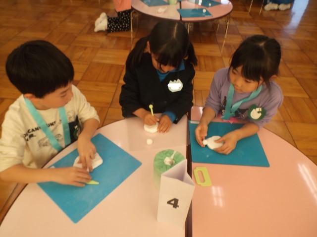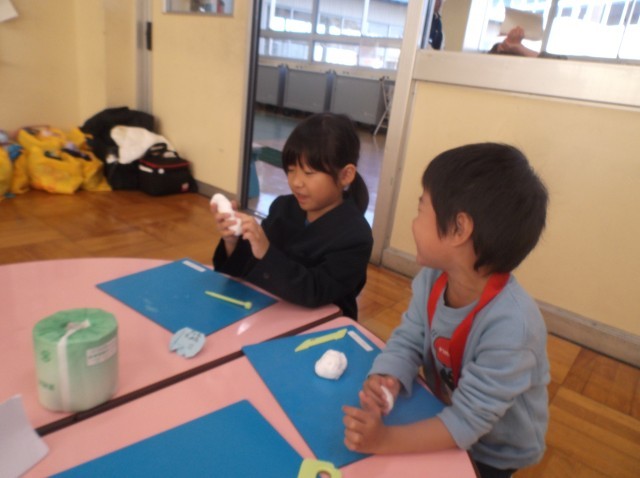 振り返りでは、「紙粘土で形を作るのが楽しかったです」「年長さんと仲よくなれてよかったです」「また一緒に遊びたいです」と感想を言った子が多く、年長さんと1年生の交流が深まった1日となりました。
