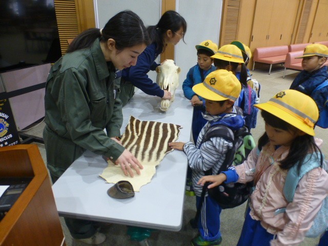 本日は「じゅういのおしごと」という教育プログラムを受けました。小学2年生の国語「どうぶつ園のじゅうい」にちなんだ、ファミリーパークの獣医さんによるお仕事のお話を聞きました。獣医の1日の仕事、獣医ならではの道具類や動物の治療の工夫などを紹介してもらい、2年生は更に学びを深めることができました。また、園内に保管してあるシマウマの頭骨や毛皮、ひづめの資料を特別に触らせてもらうことができました。