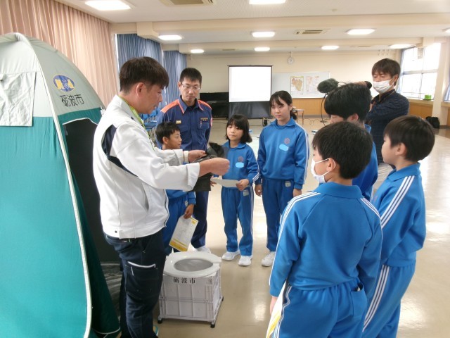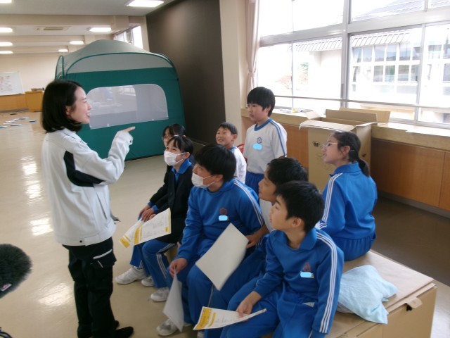 ハザードマップ等の説明を受けながら、自然災害は他人事ではなく自分たちの身にも十分に起こりうることだと実感した子供たち。その後、避難所での生活を体験し、日頃からの備えの大切さを学びました。
