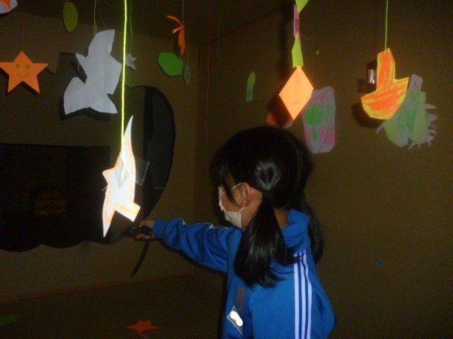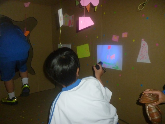次に自分で描いた絵を大きな段ボールの内側に張りました。電気を消して、段ボールの中でライトを当てると・・・自分たちが描いた絵が暗闇の中で光る仕掛けになっていました!