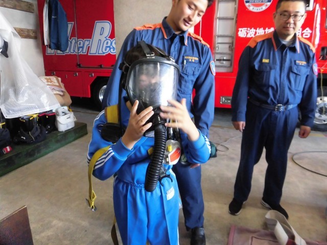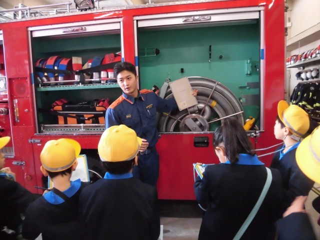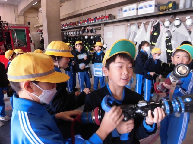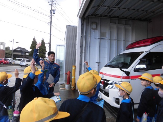 社会科の学習で、砺波地域消防組合本部に行ってきました。日々の業務をされている部屋や、仮眠室、救急車や消防車など、実際に使われている部屋や物を見せていただき、地域を守る仕事について学んできました。消火のホースにも触らせていただき、「思ったより重いね。」「こっちのは少し軽いよ。」と大興奮!「地域のために」との消防士としての思いをお聞きするなど、たくさんの質問にも答えていただきました。消防署が、少し身近になった校外学習でした。
