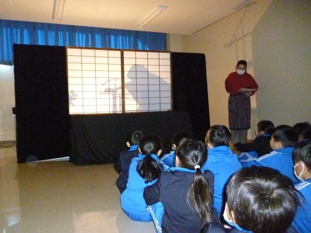 2時間目には、民具展示館で国語で学習した「たぬきの糸車」の影絵の劇を見せていただきました。影になってうつっているおかみさんやたぬきが大迫力で、子供たちは興味津々でした。