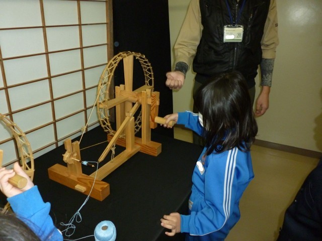 その後、糸車を実際に回させていただきました。国語でこの教材を学習した時に「糸車ってどんなものなのかな。見てみたい!」という意見がたくさんあったので、実際に触れてみることができて、子供たちはとてもうれしそうでした。子供たちは「教科書に出てきたキーカラカラ、キークルクルって音と同じだね」「昔の人の仕事を体験できたみたいでおもしろかった」と感想を話し、実際に体験したり、見たりすることの楽しさや大切さを感じました。