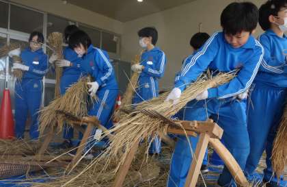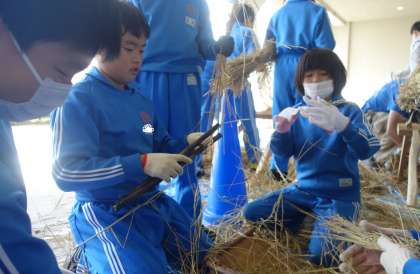 先月収穫した稲の脱穀体験をしました。