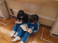 子供たちは、カッターナイフを慎重に扱いながら、かわいい窓をいくつも作りました。そして、窓の開いた部分に裏側から紙を貼り、表側から絵を描くことで窓の向こう側が見えるような工夫をしました。