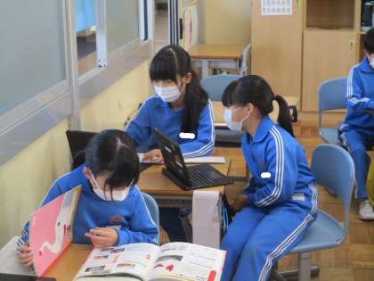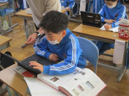 4年生の国語科では、伝統工芸について調べ、プレゼンテーションソフトを使ってまとめる活動をしています。