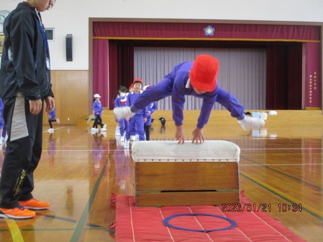 昨日に引き続き、体育の時間に講師の先生に跳び箱の指導をしていただきました。サーキット遊びの後、開脚跳びの練習をしました。昨日できなかったコースを何度も練習し、跳べるようになったり、1つ上のコースに挑戦にしたりしました。