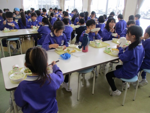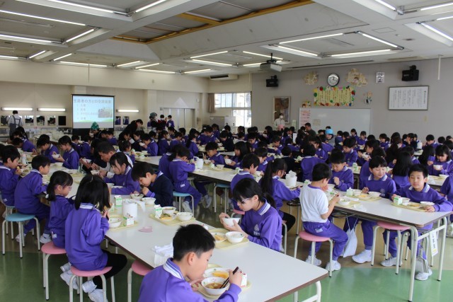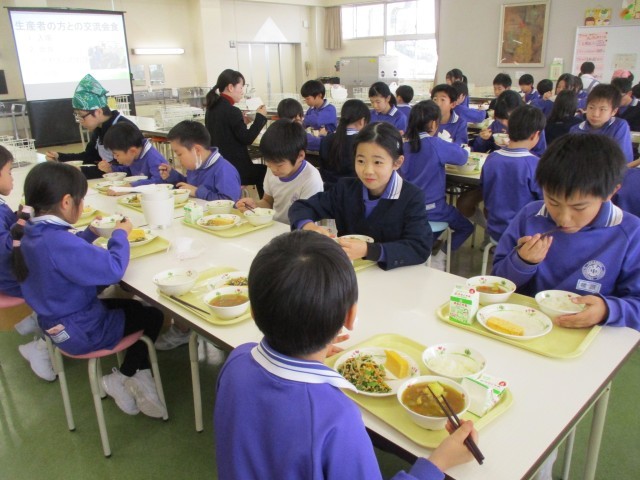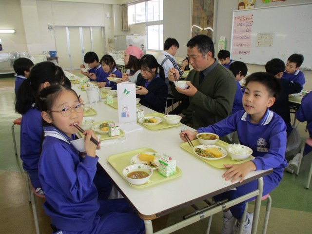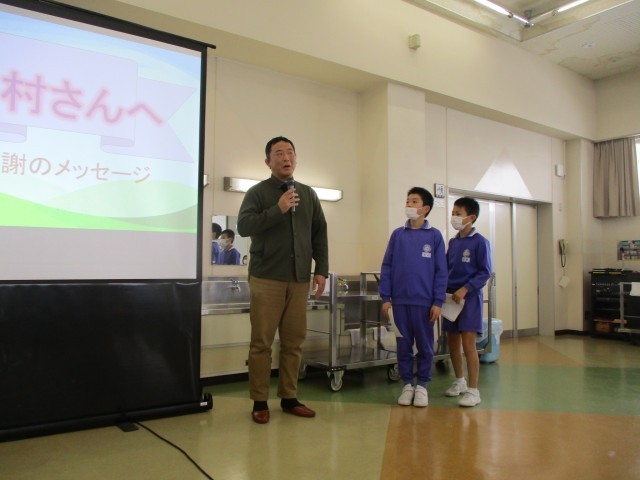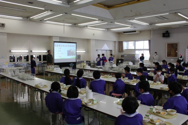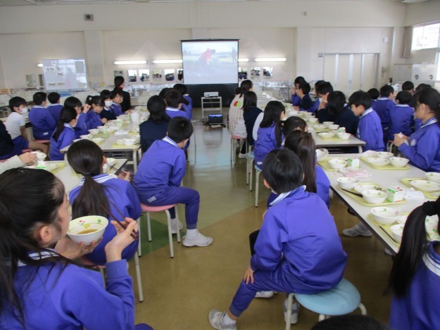 今週は学校給食週間となっています。給食に関わって下さる方々に感謝の気持ちをもって食べています。今日は、ねぎ生産者の方をお迎えし、会食会を行いました。12月に給食委員会が子ども特派員として、取材や収穫体験をさせていただいた農家さんです。会食会では、その時の様子の映像を見たり、感謝の気持ちをこめたカードをお渡ししたりしました。子供たちは、生産者の方がねぎの栽培についてお話されるのを聞いて、生産される大変さだけでなく、農業への魅力も感じていました。これからも、食に携わって下さる方々に感謝の気持ちをもって、食事をしていきます。