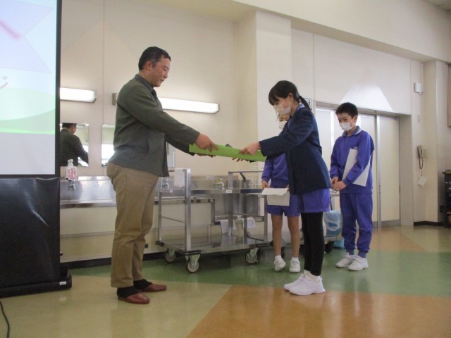今週の学校給食週間では、給食に関わって下さている方々に感謝の気持ちを伝えています。今日はいつもお世話になっている配膳員さんへの感謝の集いを行いました。2年生の代表の子供が感謝の言葉を伝えて、メッセージカードを渡しました。また、3年生の代表の子供たちは、給食センターの方に手渡しました。ご飯やパン、牛乳の業者の方にもお渡しすることにしています。
