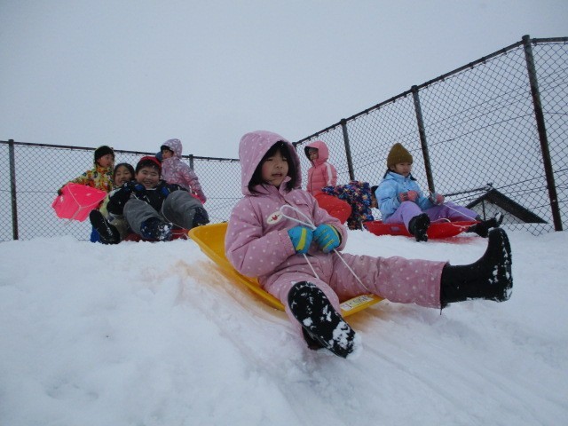 今日は雪遊びをしました。雪の冷たさを感じながら雪だるまを作ったり、そりをしたり、雪合戦をしたりしました。冬の寒さを吹き飛ばすくらい元気いっぱいに遊びました。